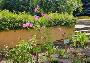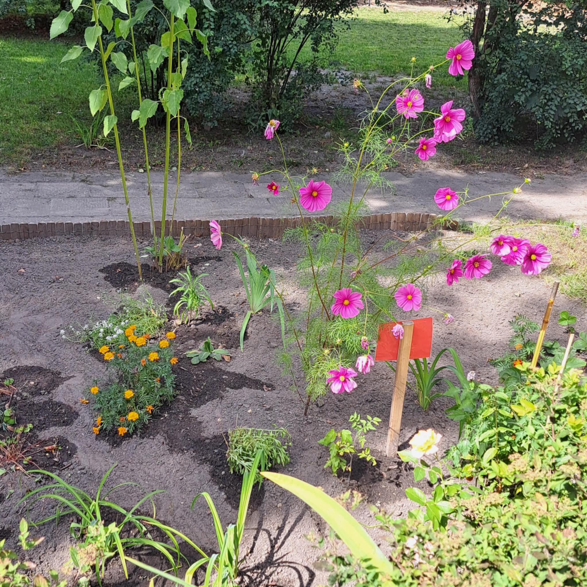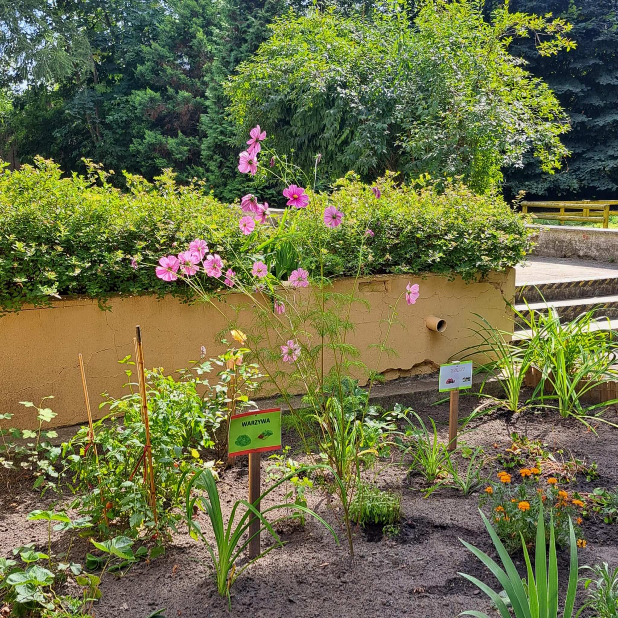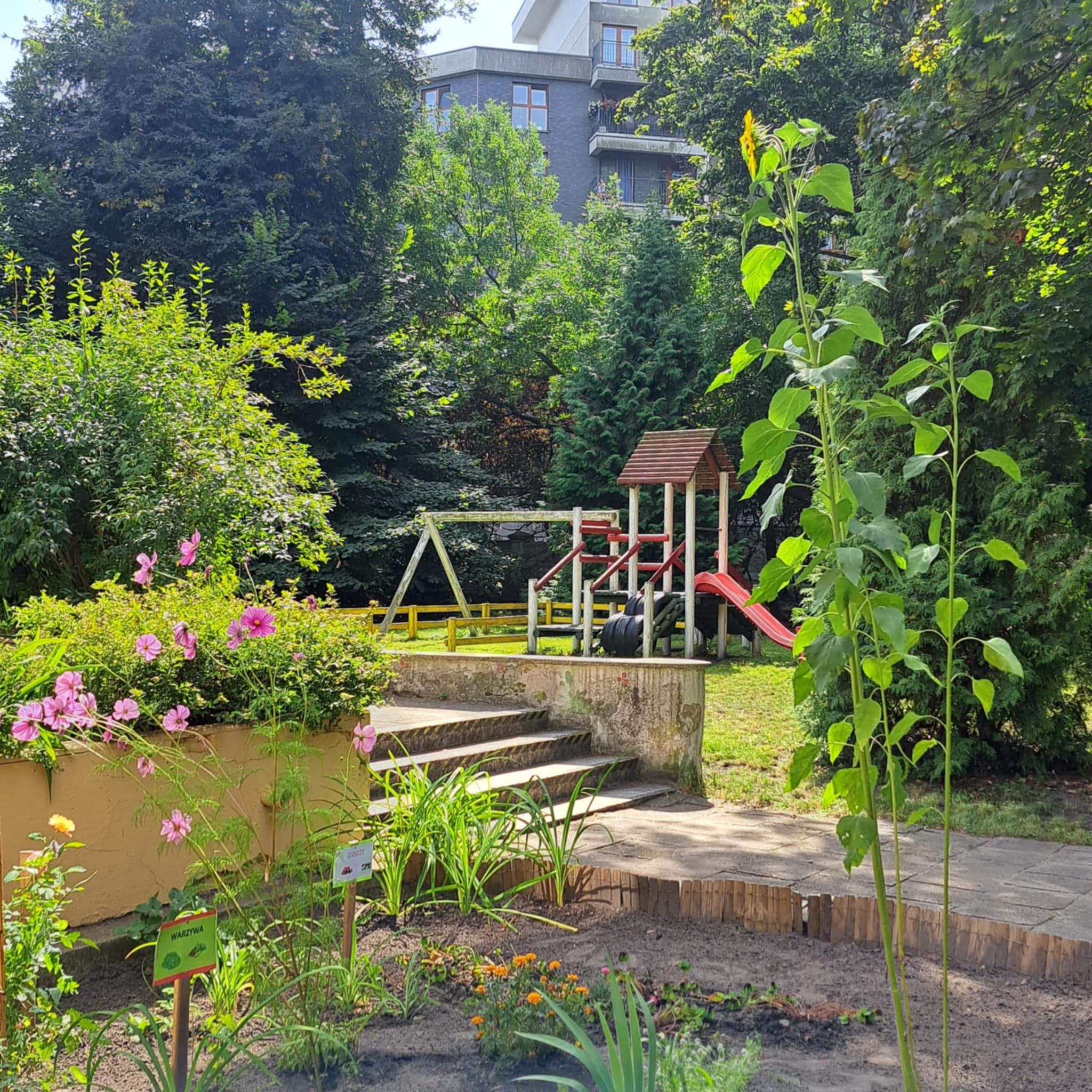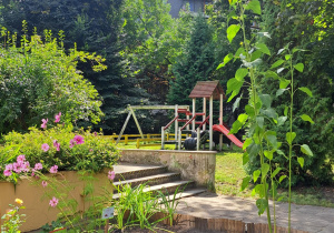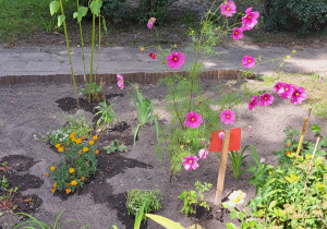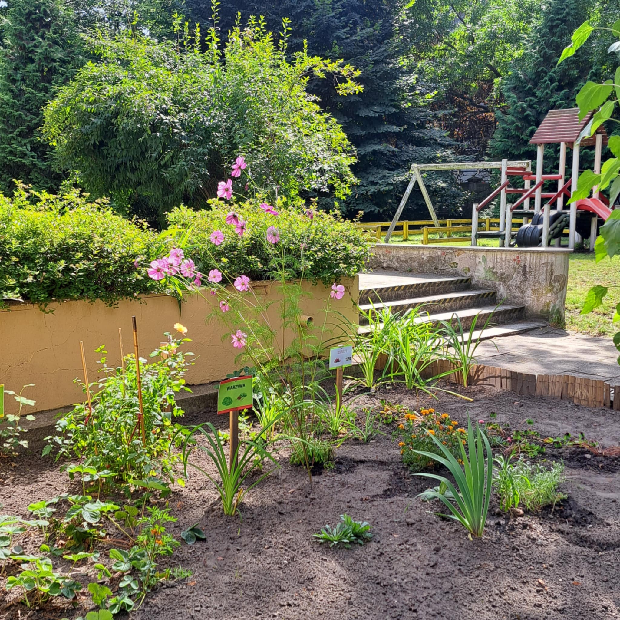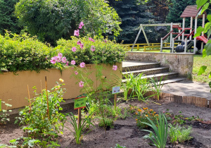 RABATA KWIATOWA: na niej dzieci zasadziły różnorodne gatunki kwiatów wieloletnich i jednorocznych. Różnorodność ich kolorów, kształtów i okresów kwitnienia wpływa na pobudzanie zmysłów wzroku, węchu u dzieci.